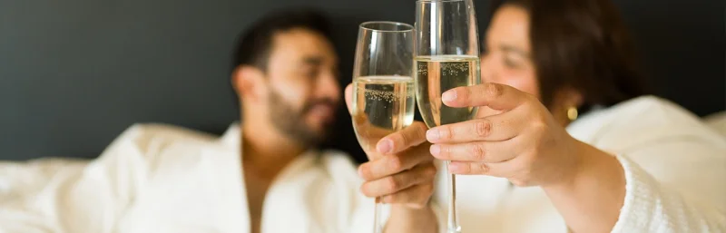 Saapumishetkellä huoneessa odottavat viilentävä kuohuviini ja virkistävä hedelmätarjotin.